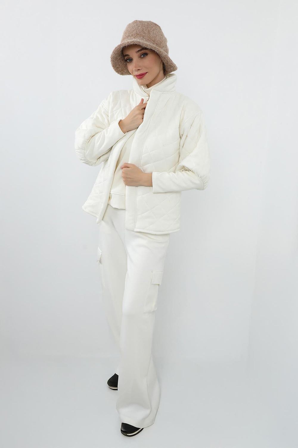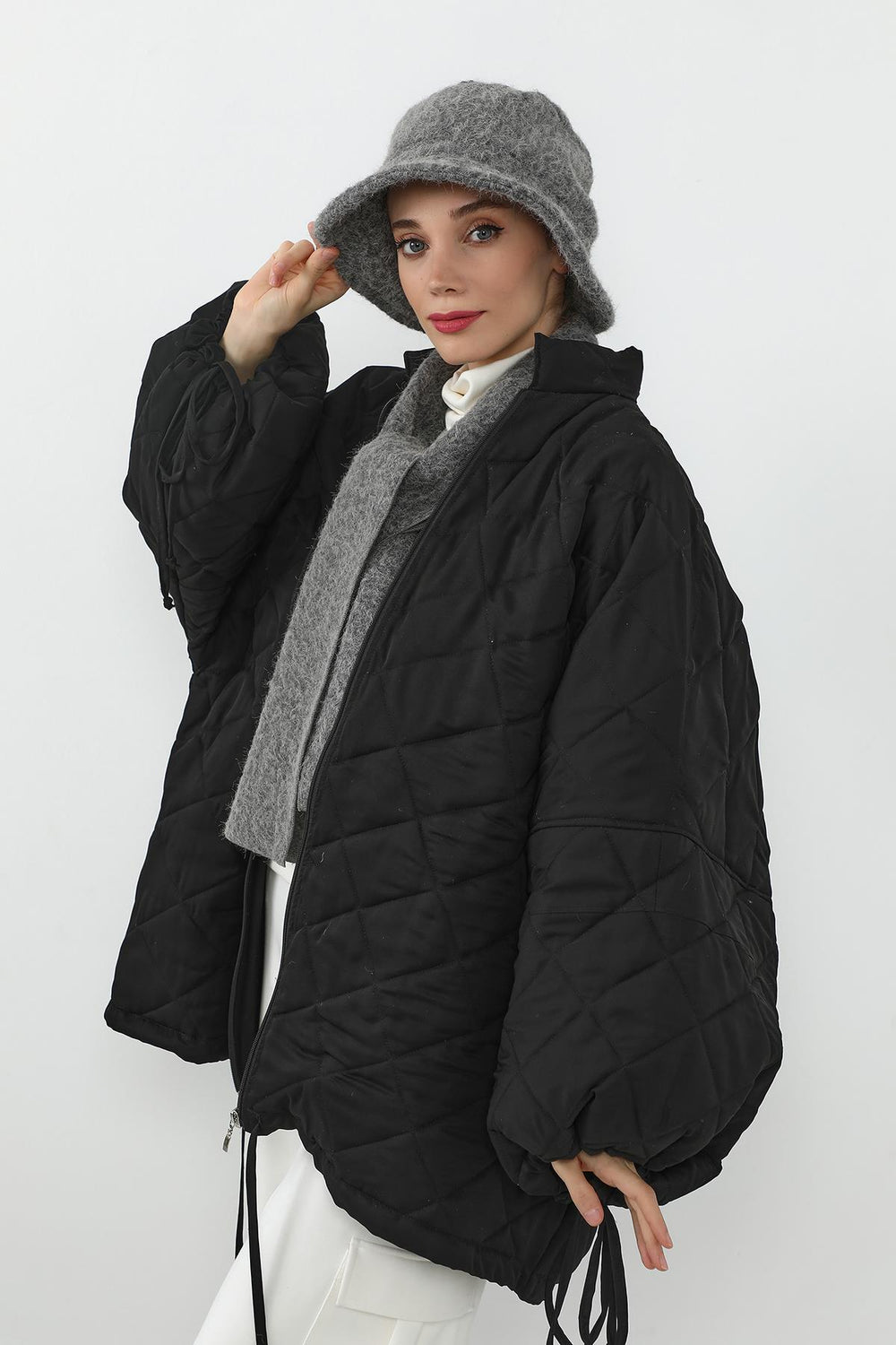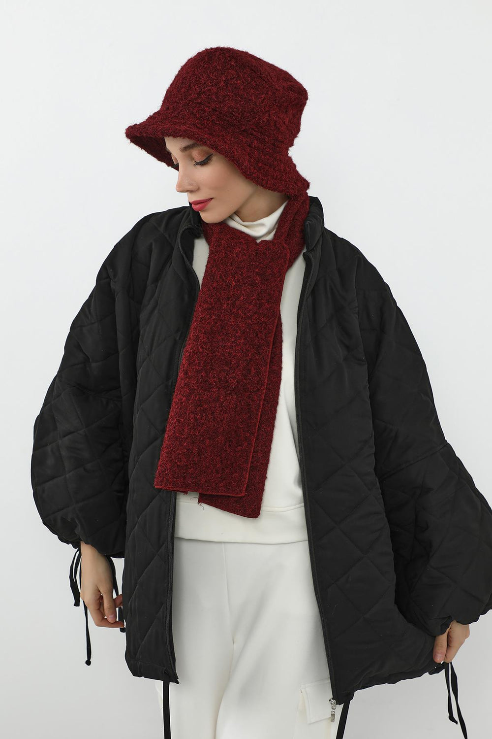 *Takım içeriğinde yer alan şapkalı bone, klasik bone modellerinden farklı olarak yüz hattını yumuşatan zarif bir formdadır.
